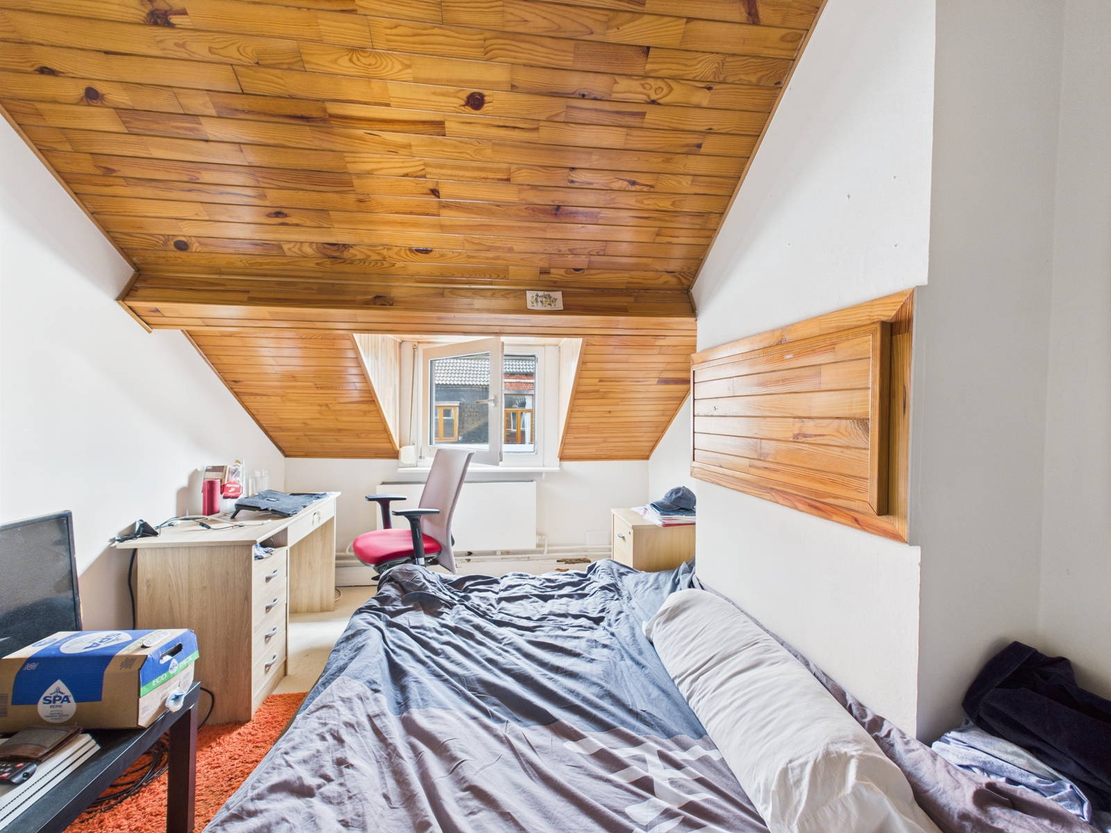 Entre le rez-de-chaussée et le premier étage, un demi-étage accueille un WC séparé et une grande chambre.