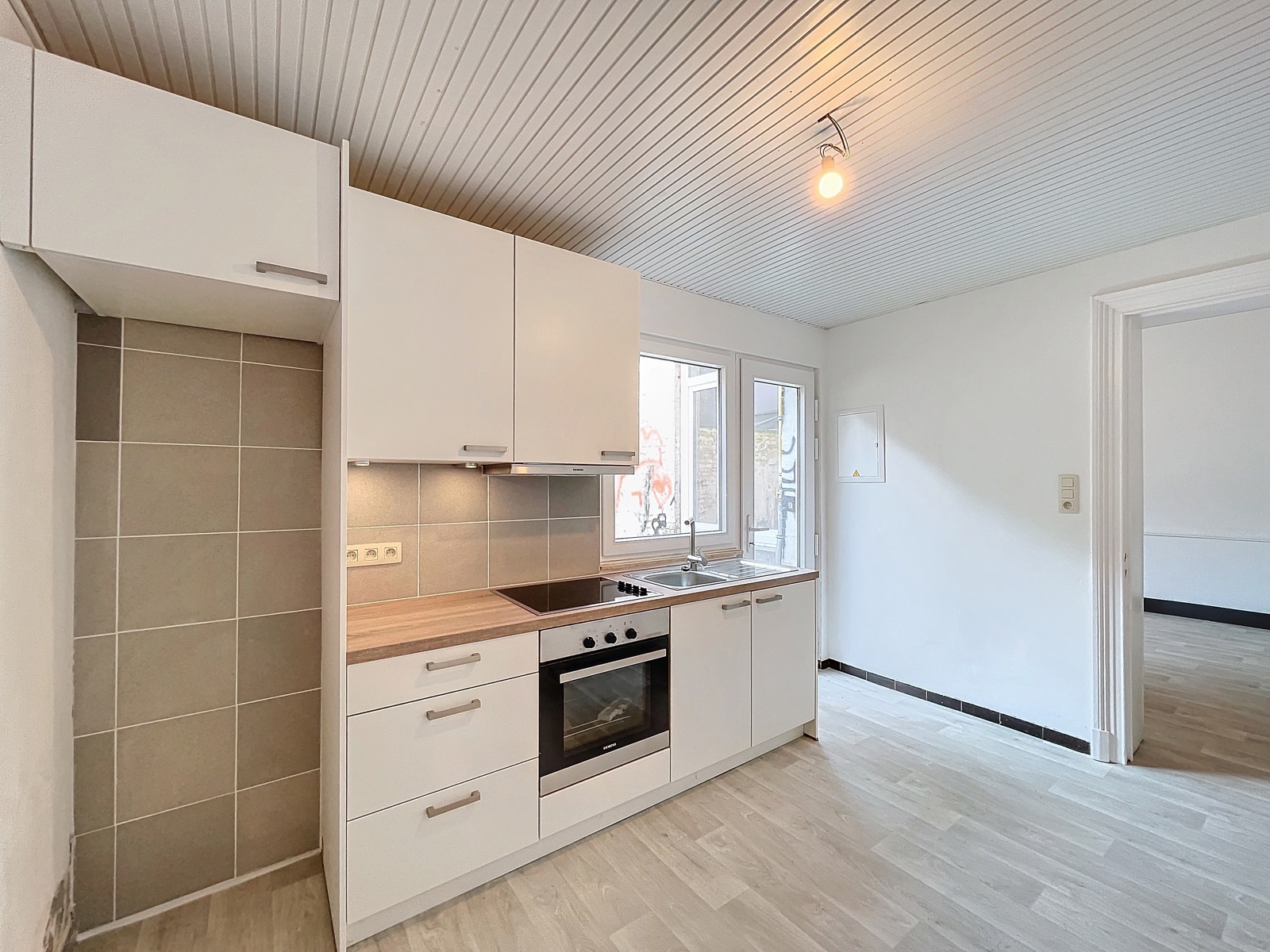 * Au rez-de-chaussée, un appartement 2 chambres de +- 92 m² selon PEB (E, 381 kWh/m².an, 20230802001500, 70 kg CO2/an), comprenant un séjour de 18 m², une cuisine équipée neuve, une chambre de +-18m²une chambre à l’étage de +-18 m², une cour intérieure de +- 15 m² ainsi qu’une sdd + WC + buanderie.