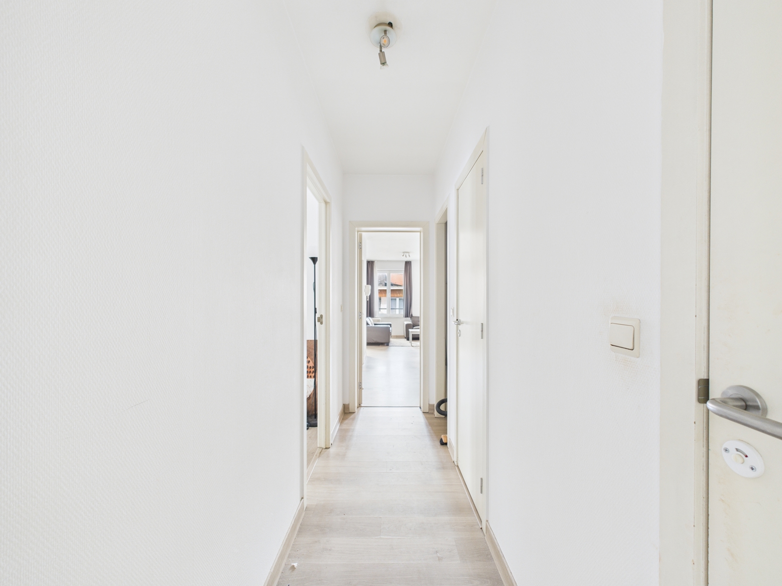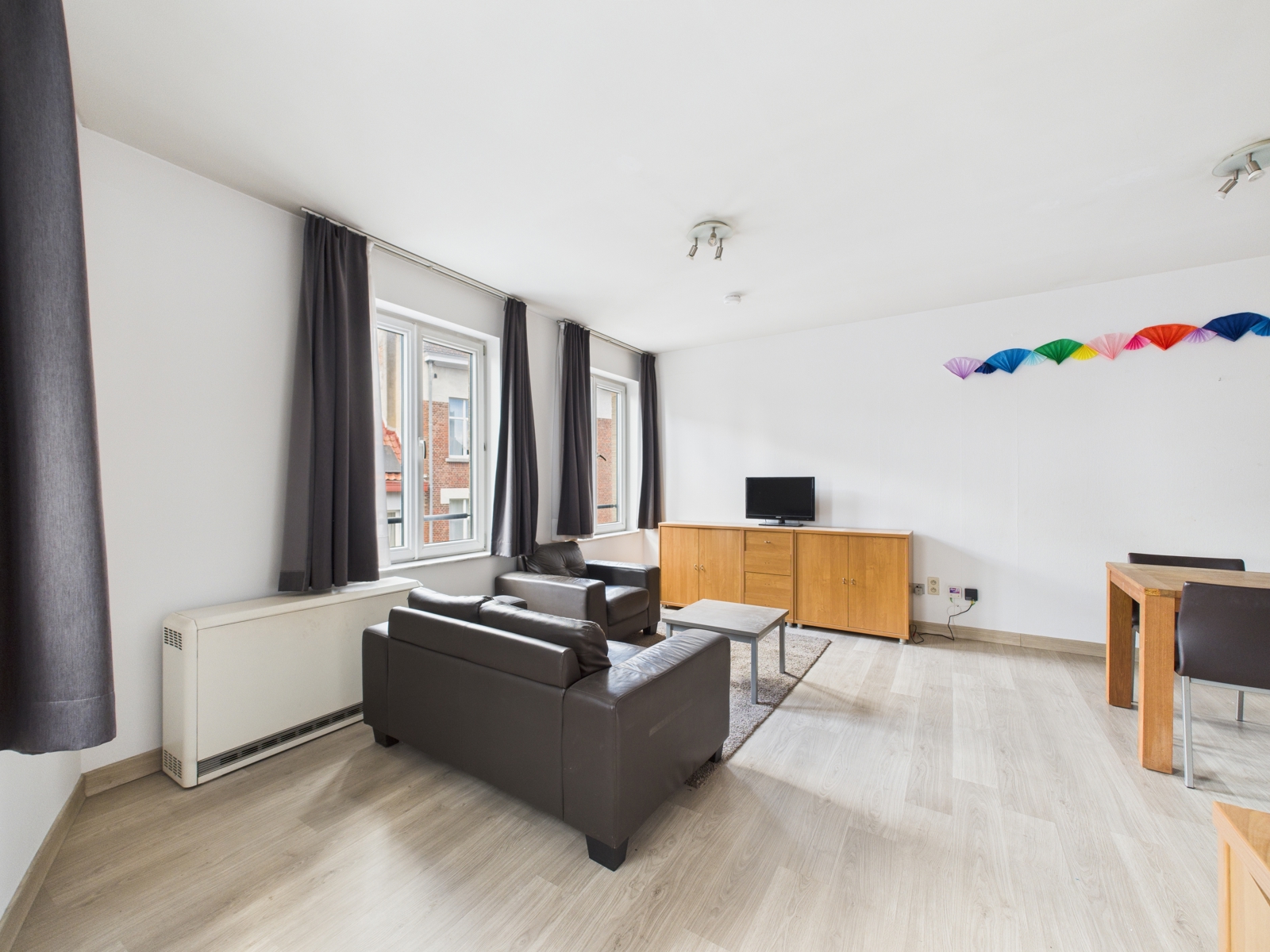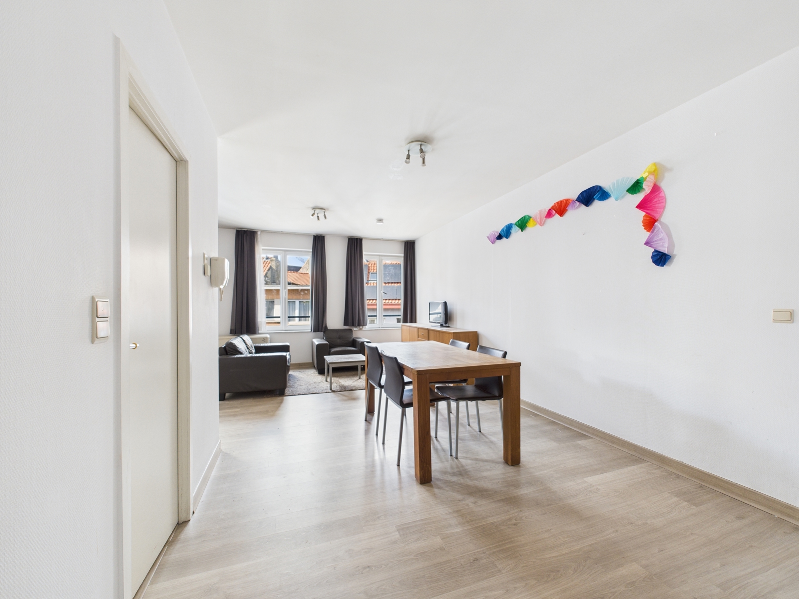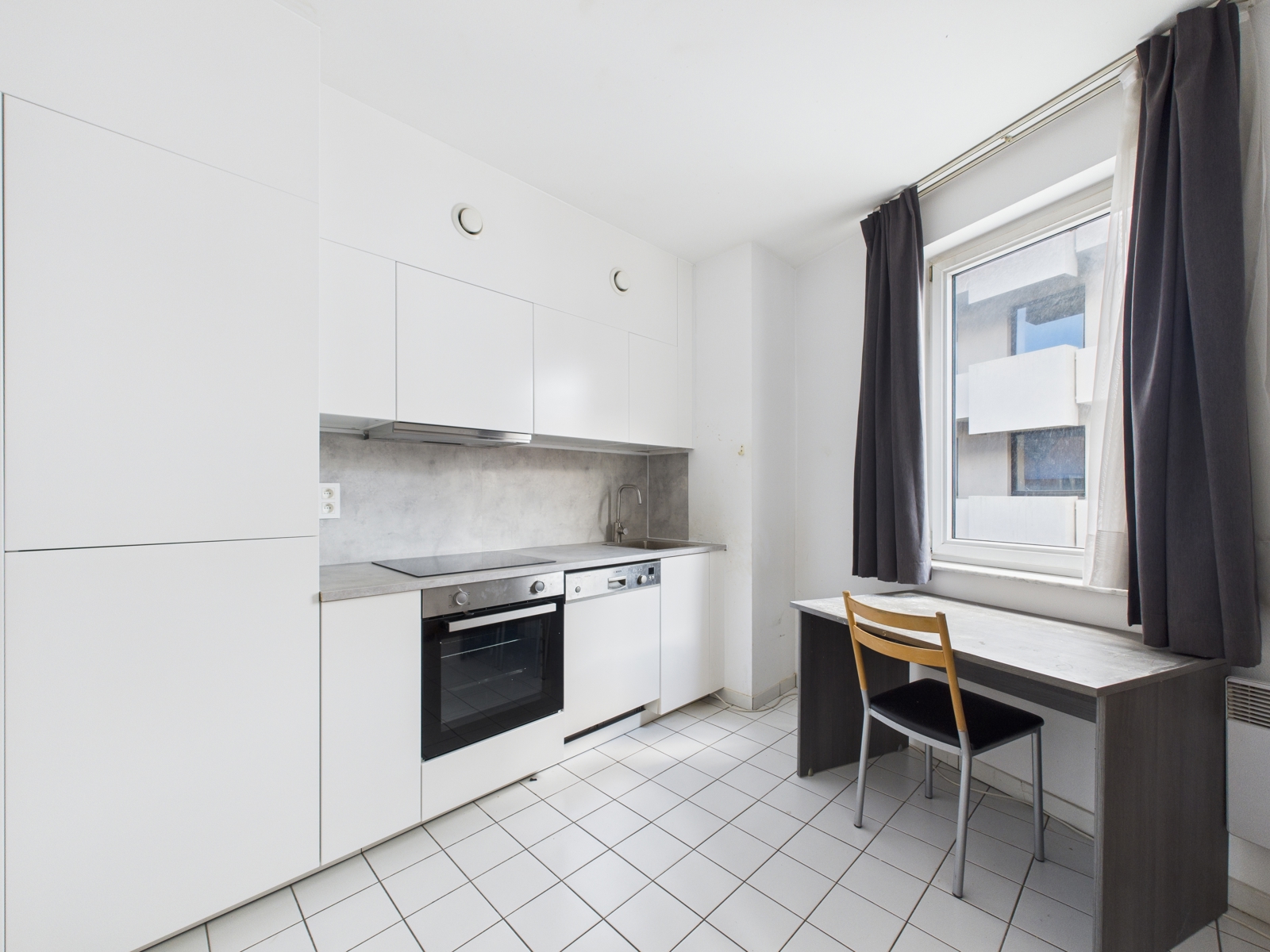 The property consists of a dining room, a living room, a separate kitchen, a cloakroom, a separate toilet, a large bedroom, a medium-sized bedroom, a bathroom, and an optional garage for €100/month. Shared laundry facilities in the basement. New kitchen, double glazing, wooden flooring, secure building.