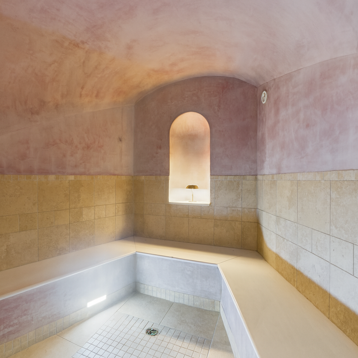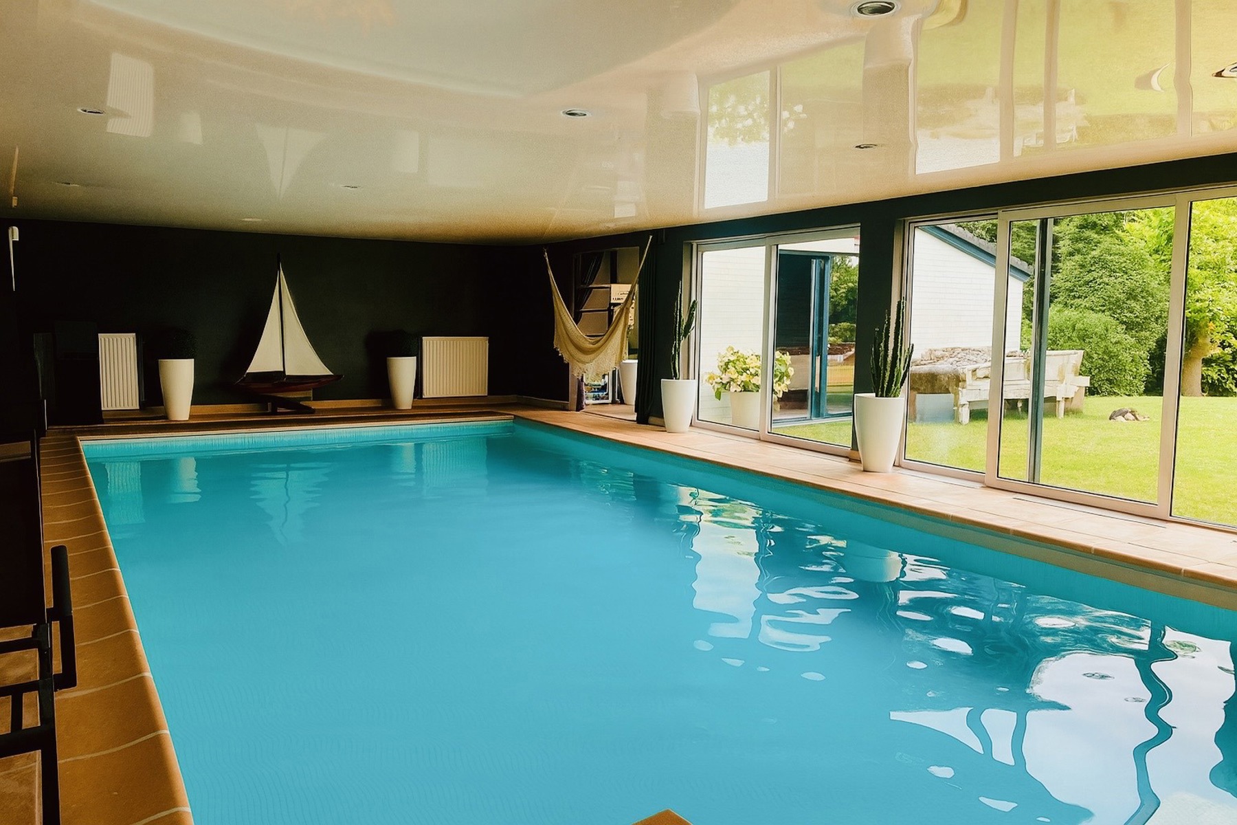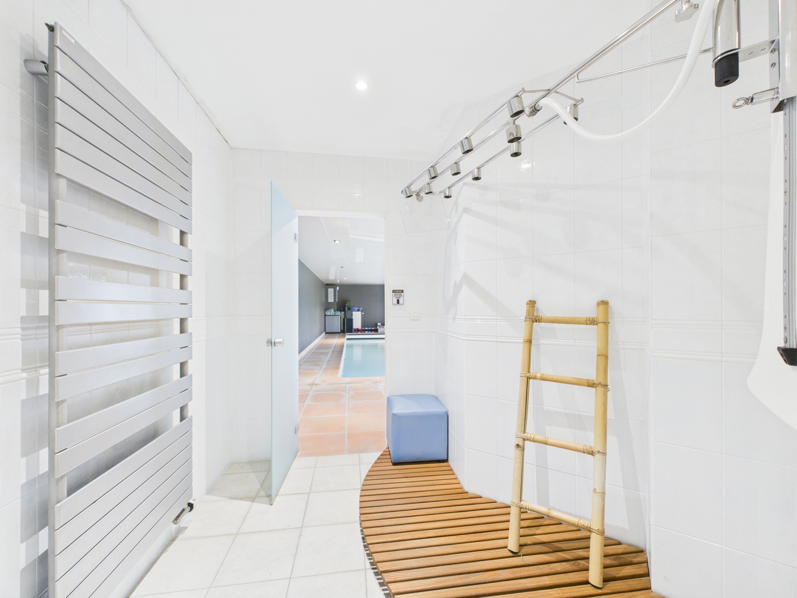 The spa area (approximately 350 m²) features a 10x5 m indoor pool with counter-current swimming and integrated sound system, a tadelakt hammam with shower, jacuzzi, steam room, high-pressure showers, WC, and relaxation room. The upper floor comprises a living room with an open-plan kitchen, two bedrooms and a toilet.