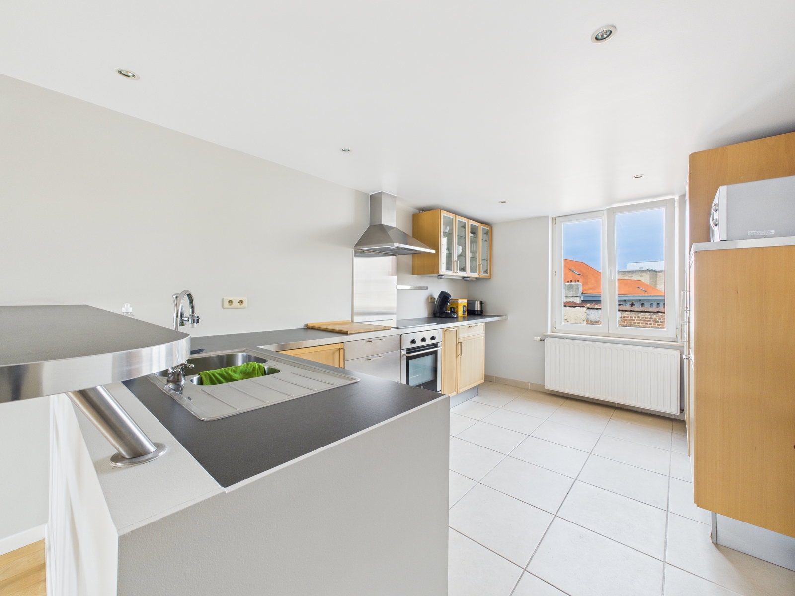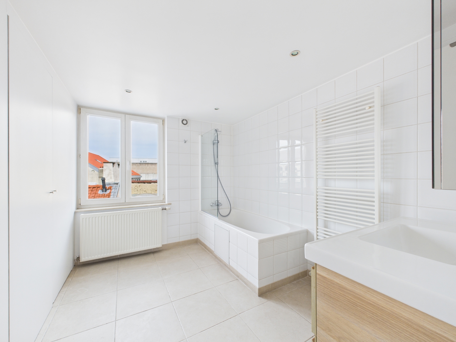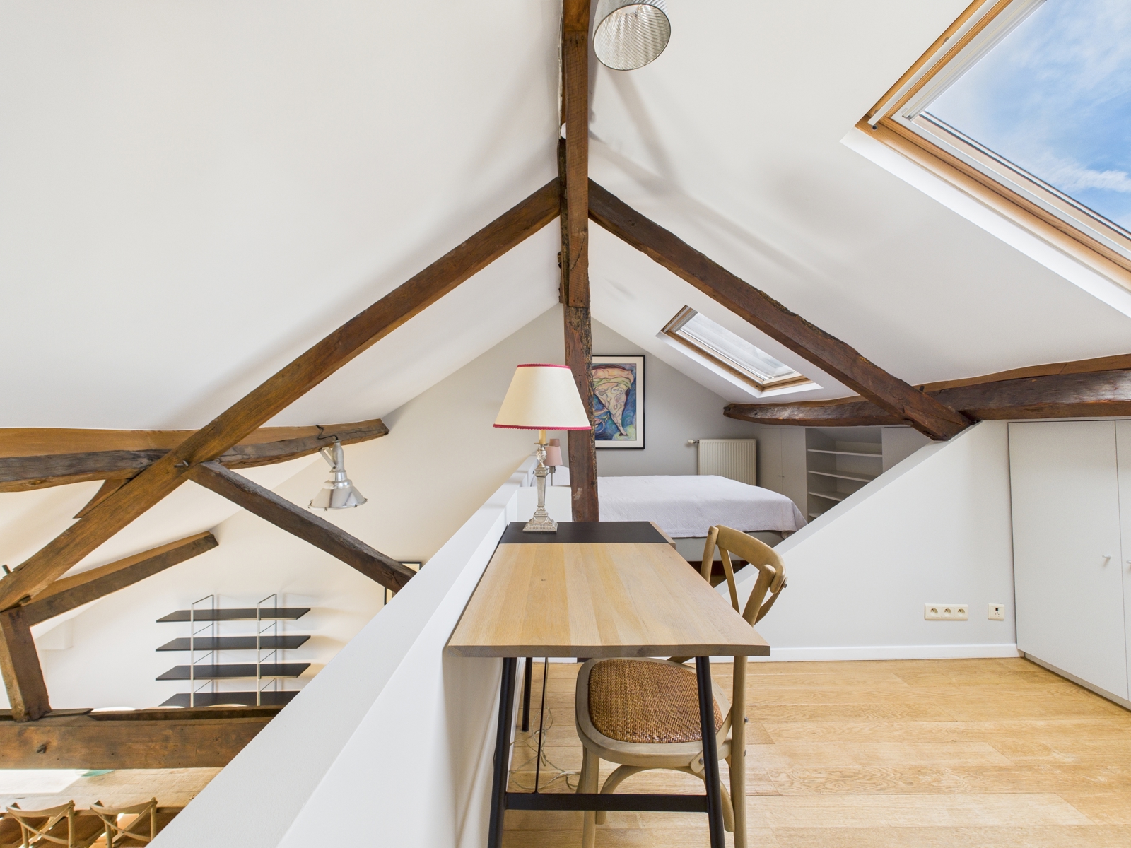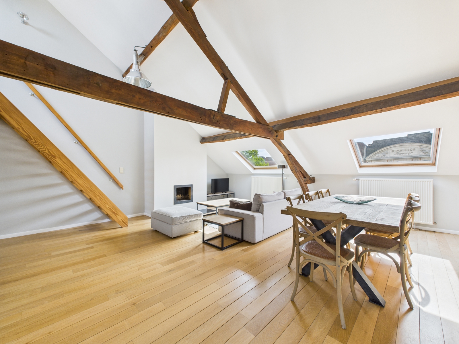 Gelegen op de bovenste verdieping van het gebouw, beschikt de woning over een prachtige woon-/eetkamer met open haard, een volledig uitgeruste open keuken, een badkamer met een wasruimte met wasmachine en droger, een slaapkamer op de mezzanine met een kleedkamer en een kantoorruimte met inbouwkasten. De servicekosten van € 70 zijn inclusief water en een vast bedrag voor het onderhoud van de gemeenschappelijke ruimtes. Met een bewonerskaart kunt u op het plein parkeren. De buurt biedt een breed scala aan winkels. Openbaar vervoer is vlakbij (bus, tram). PEB D, 183 kWh/m²/jaar, 38 kgCO²/m²/jaar