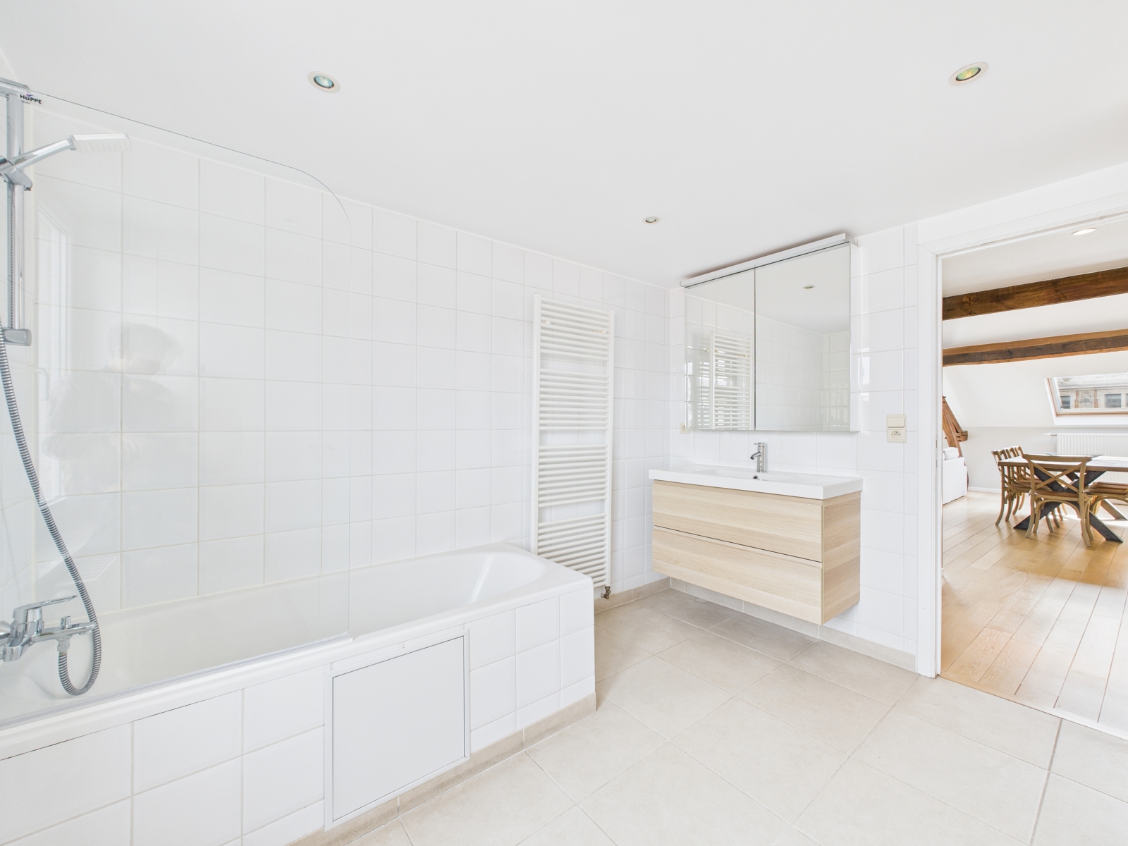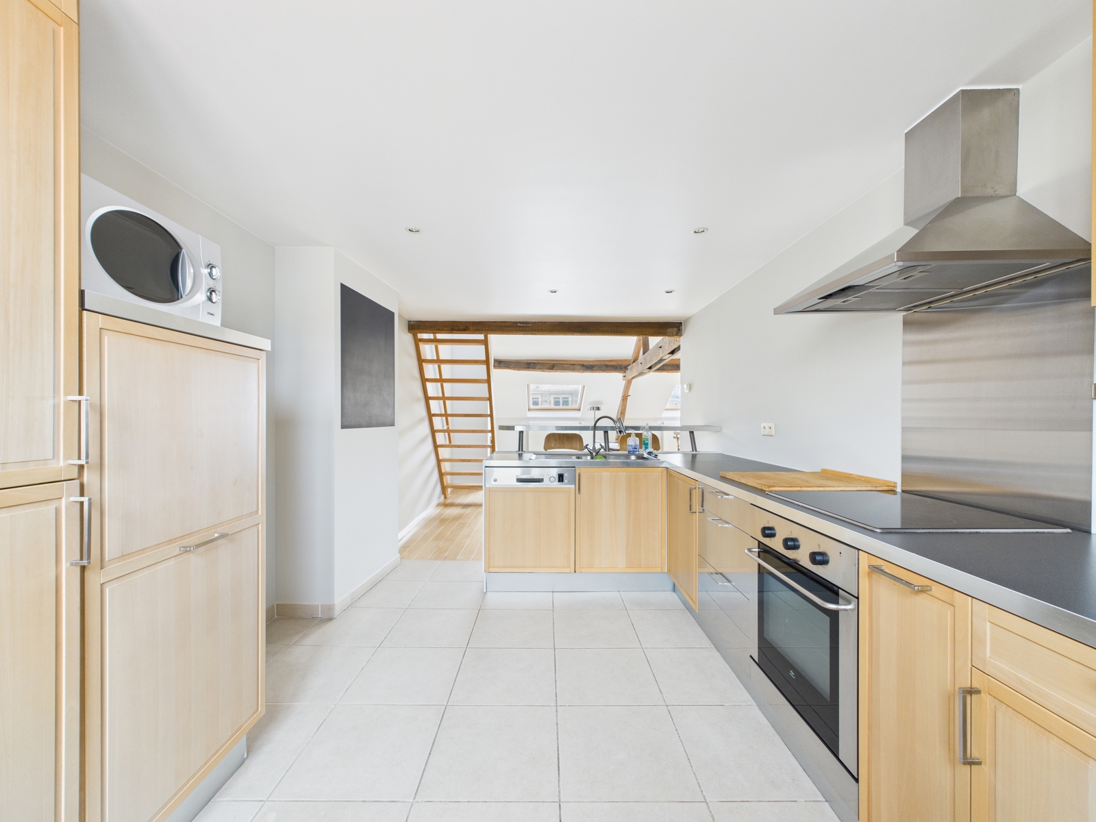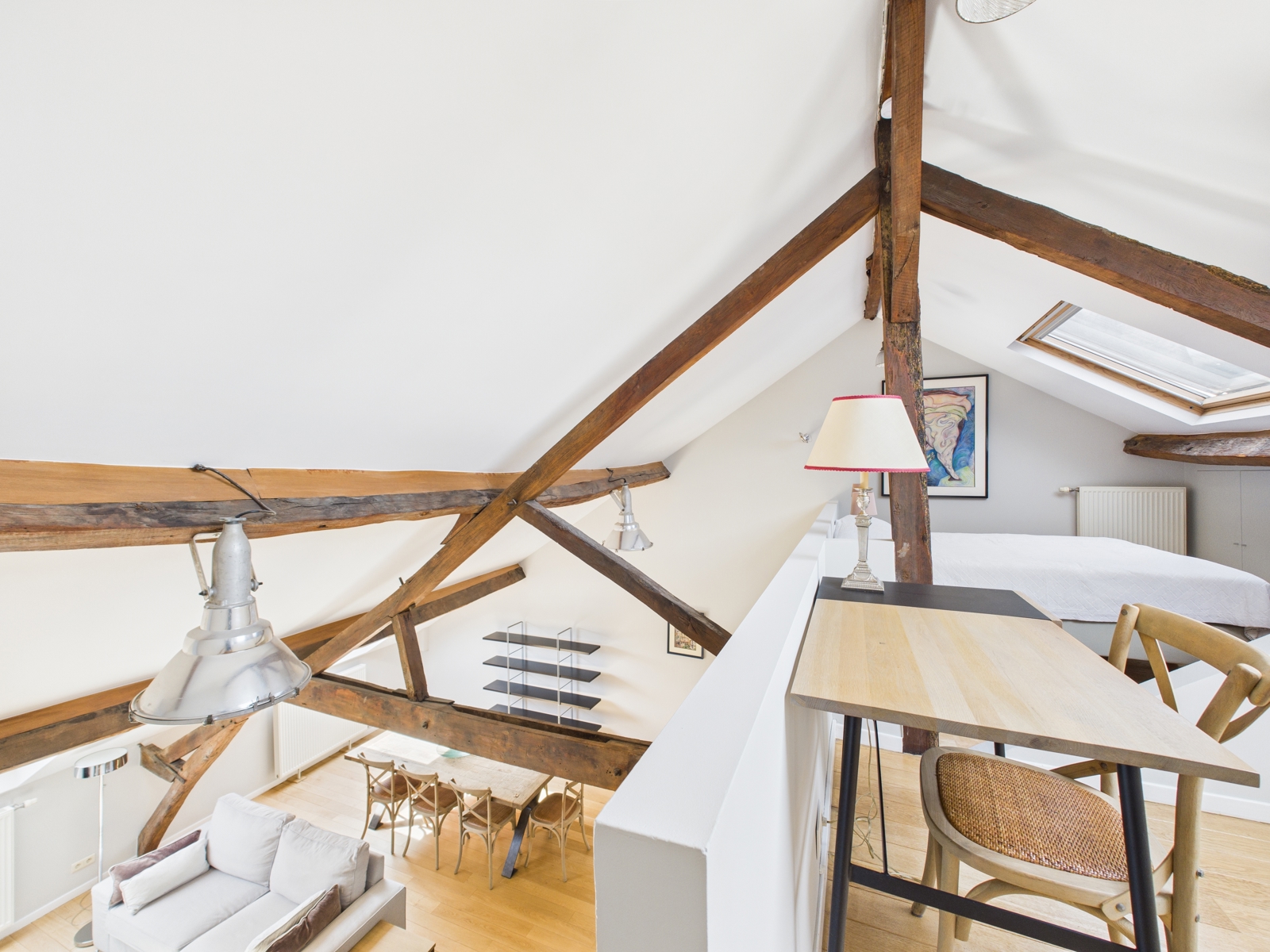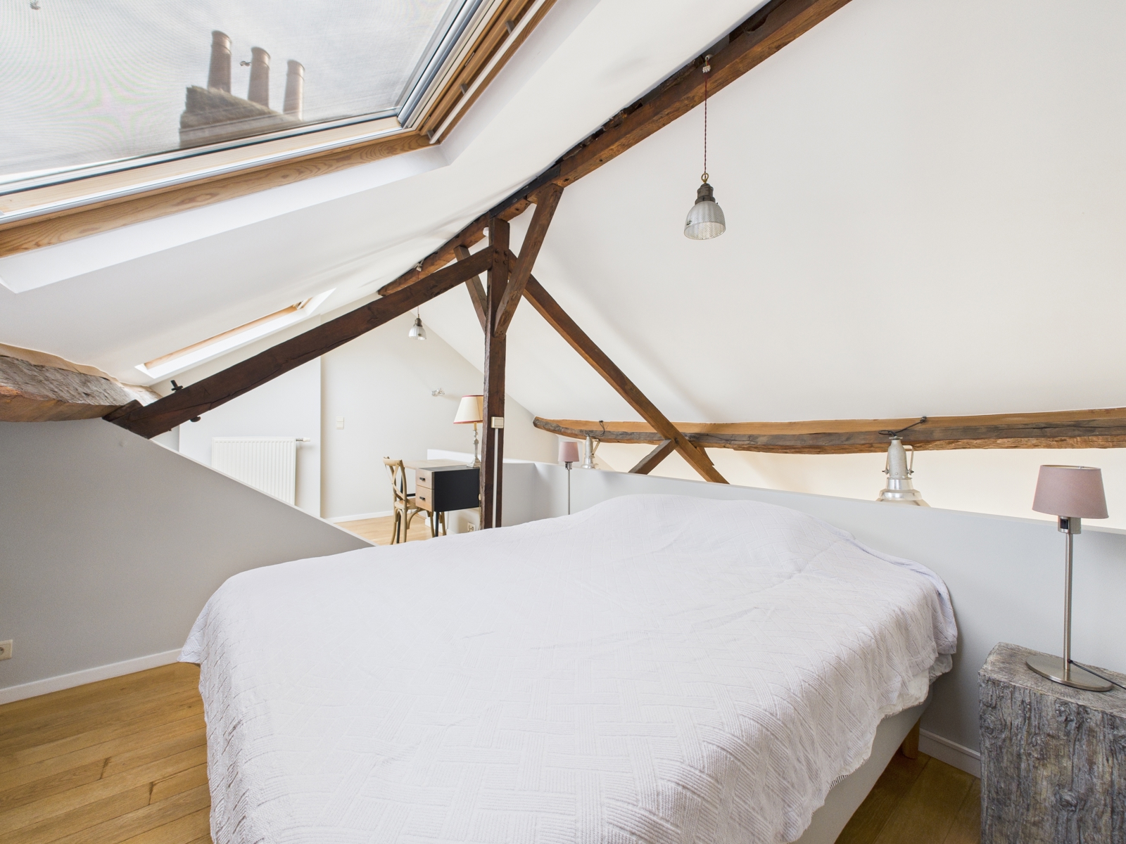 Gelegen op de bovenste verdieping van het gebouw, beschikt de woning over een prachtige woon-/eetkamer met open haard, een volledig uitgeruste open keuken, een badkamer met een wasruimte met wasmachine en droger, een slaapkamer op de mezzanine met een kleedkamer en een kantoorruimte met inbouwkasten. De servicekosten van € 70 zijn inclusief water en een vast bedrag voor het onderhoud van de gemeenschappelijke ruimtes. Met een bewonerskaart kunt u op het plein parkeren. De buurt biedt een breed scala aan winkels. Openbaar vervoer is vlakbij (bus, tram). PEB D, 183 kWh/m²/jaar, 38 kgCO²/m²/jaar