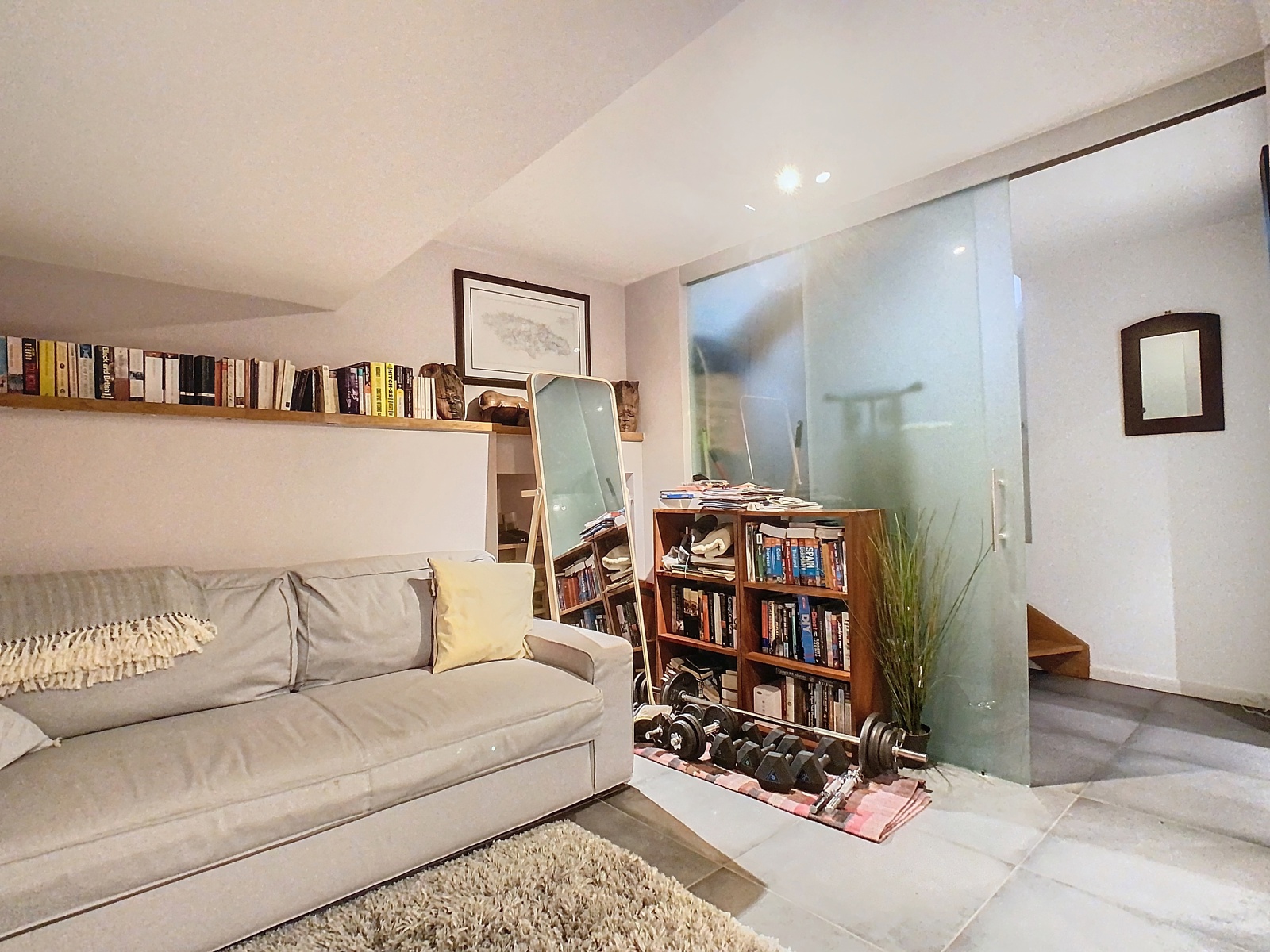 Op de 2e verdieping bestaat het uit een lichte woonkamer van ongeveer 60m² met een open haard, een volledig ingerichte open keuken met centraal eiland, een ouderslaapkamer van ongeveer 30m² met dressing en aangrenzende doucheruimte. Op de benedenverdieping een tweede slaapkamer met dressing en badkamer. Op de tussenverdieping een derde slaapkamer met studeerhoek en badkamer. Gemeenschappelijke tuin. Kelder. Overdekte parkeerplaats en fietsenstalling. Kosten van €50/maand voor onderhoud van gemeenschappelijke ruimtes.