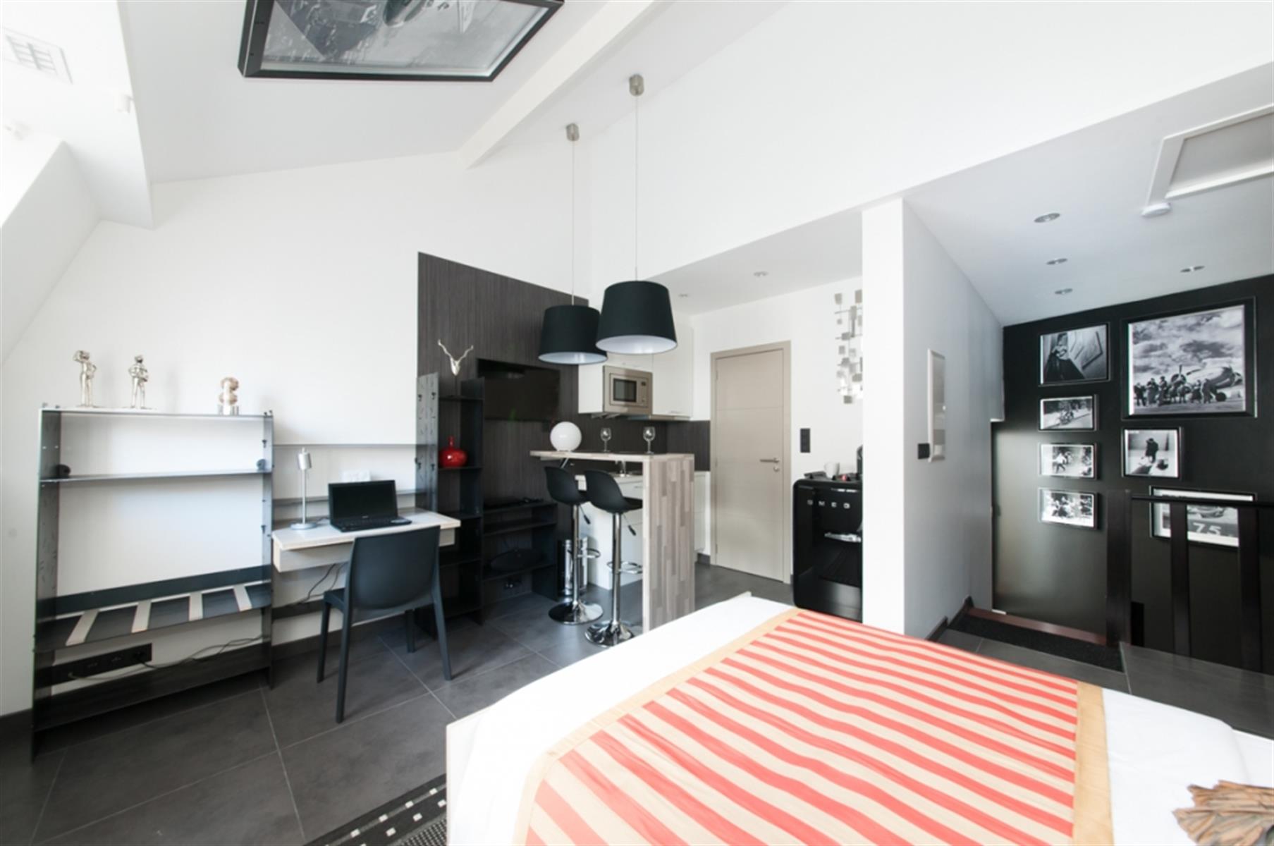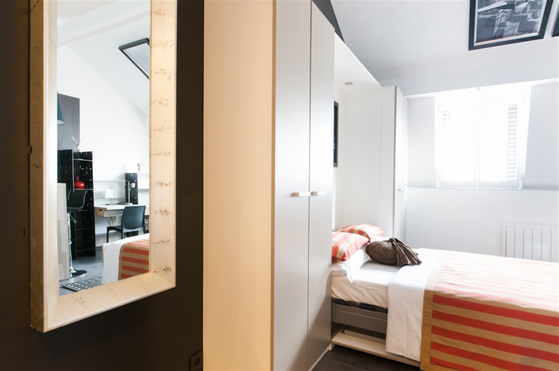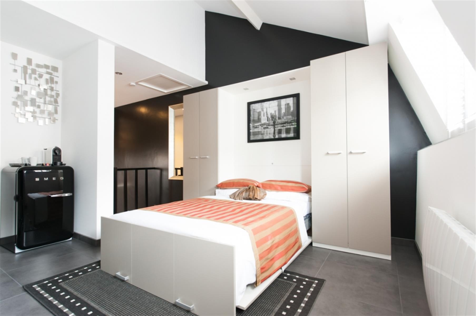 Sint-Gorikszaal - Gemeubileerde studio - In het hart van Brussel, tussen de wijken Beurs, Sint-Gorikshallen en Dansaert, studio met een resoluut moderne stijl. De studio's zijn uitgerust met kantoormeubilair ontworpen door een ontwerper van de Zavel. Een kast met een opklapbed en een kluisje. Een kitchenette uitgerust met een bartafel (afzuigkap, retro SMEG-koelkast, keramische kookplaat, magnetron, keukenbenodigdheden). Een doucheruimte met wastafel en toilet. Het gebouw is volledig beveiligd, met toegangscontrole met code en gepantserde deuren.